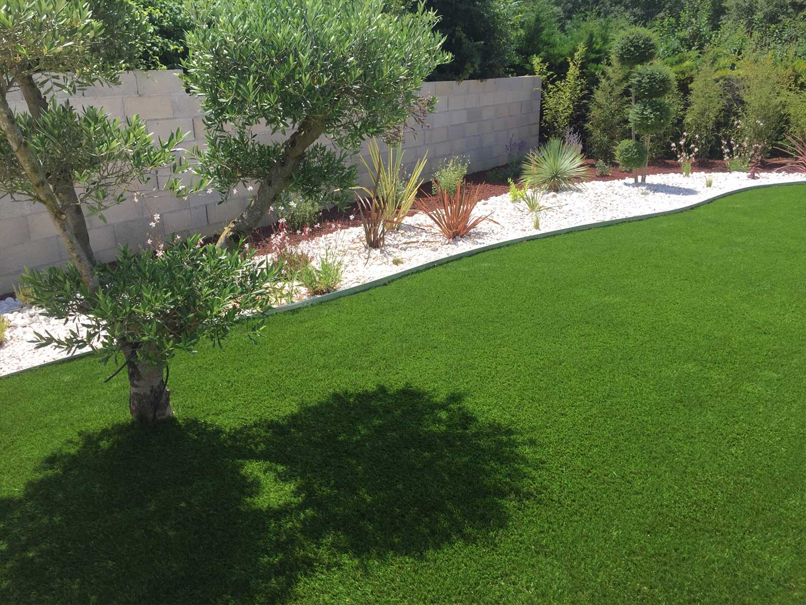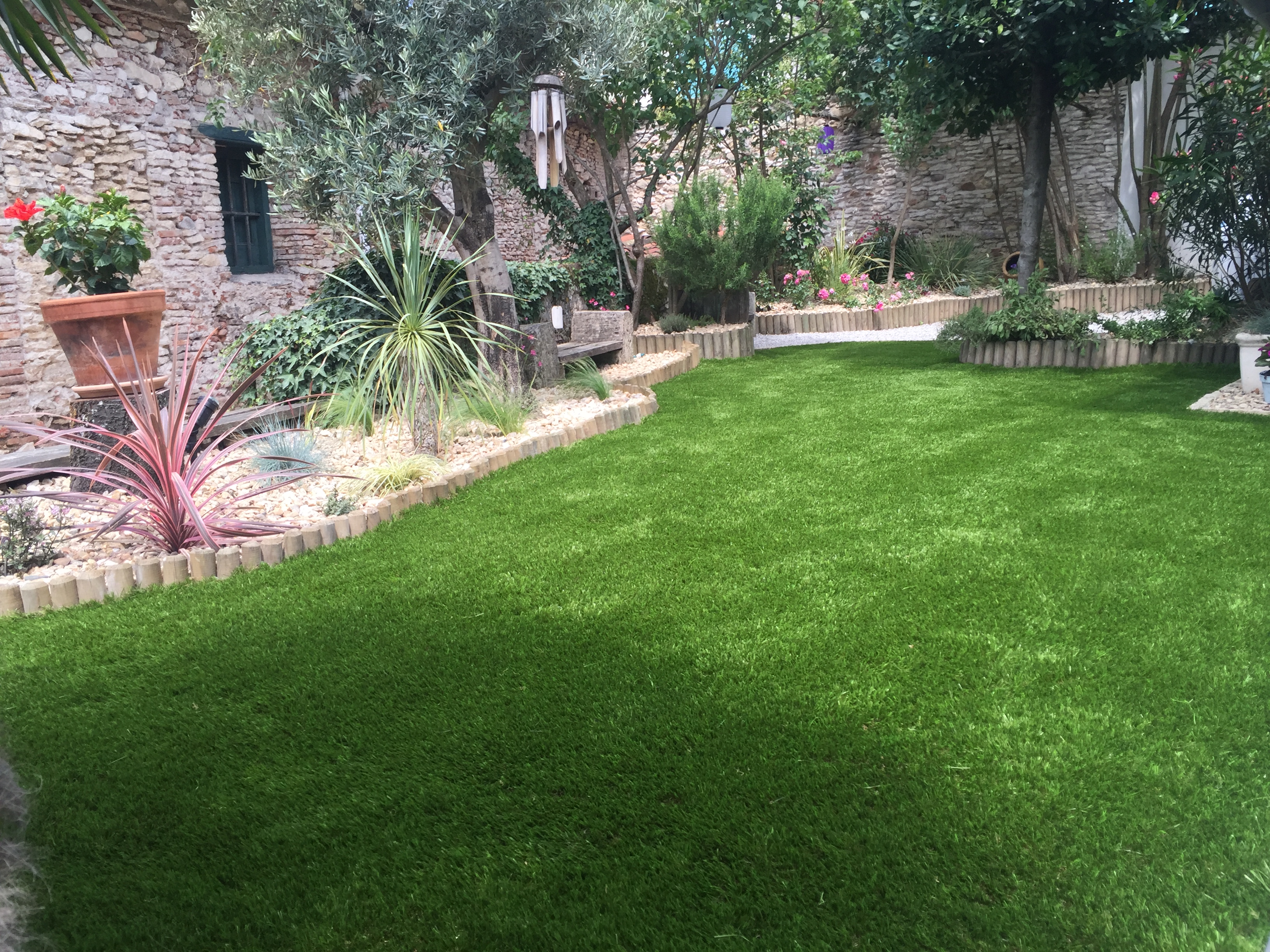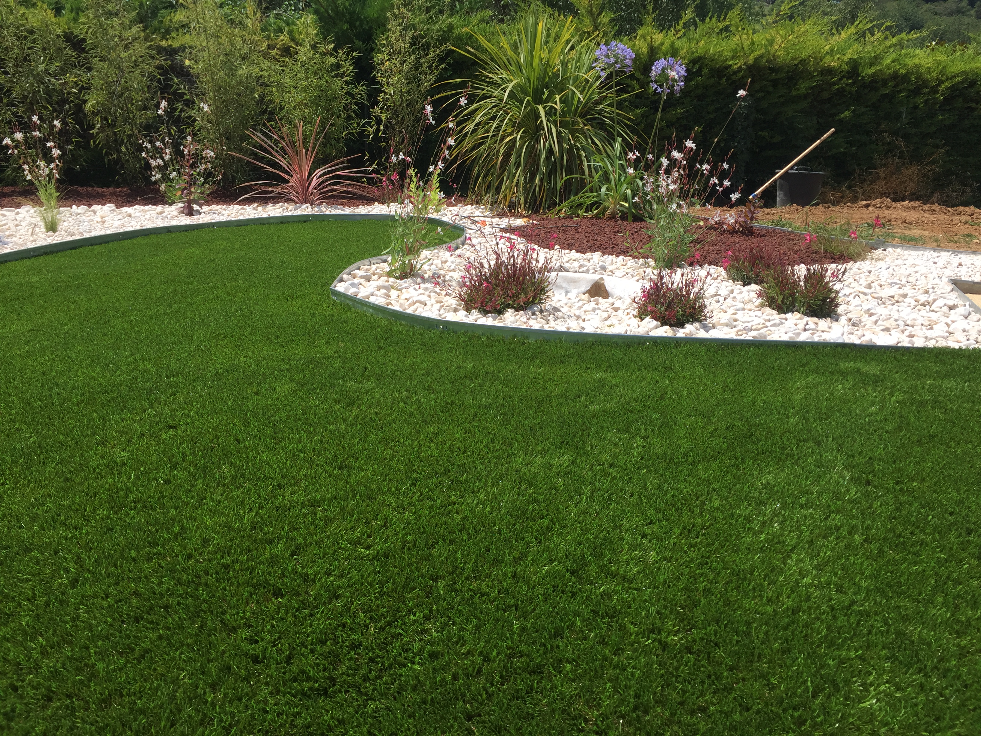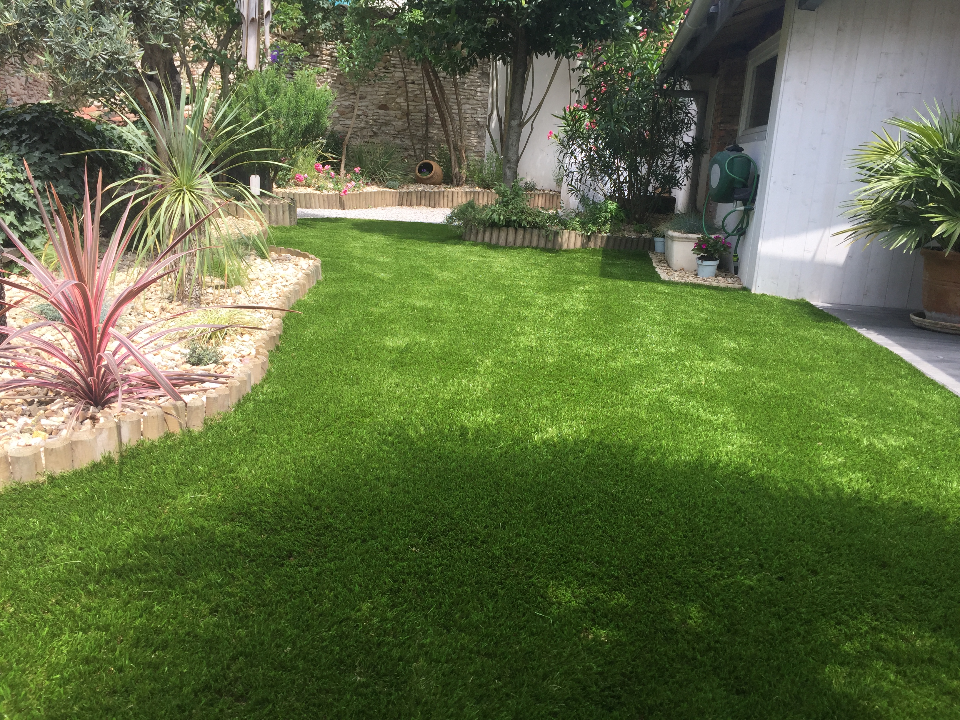 Nous posons uniquement du synthétique haut de gamme : rendu naturel, on est loin de l'effet plastique. L'avantage du synthétique : Le rendu est "comme sur les photos", et il n'y a aucun entretien ni évidemment d'arrosage à faire.