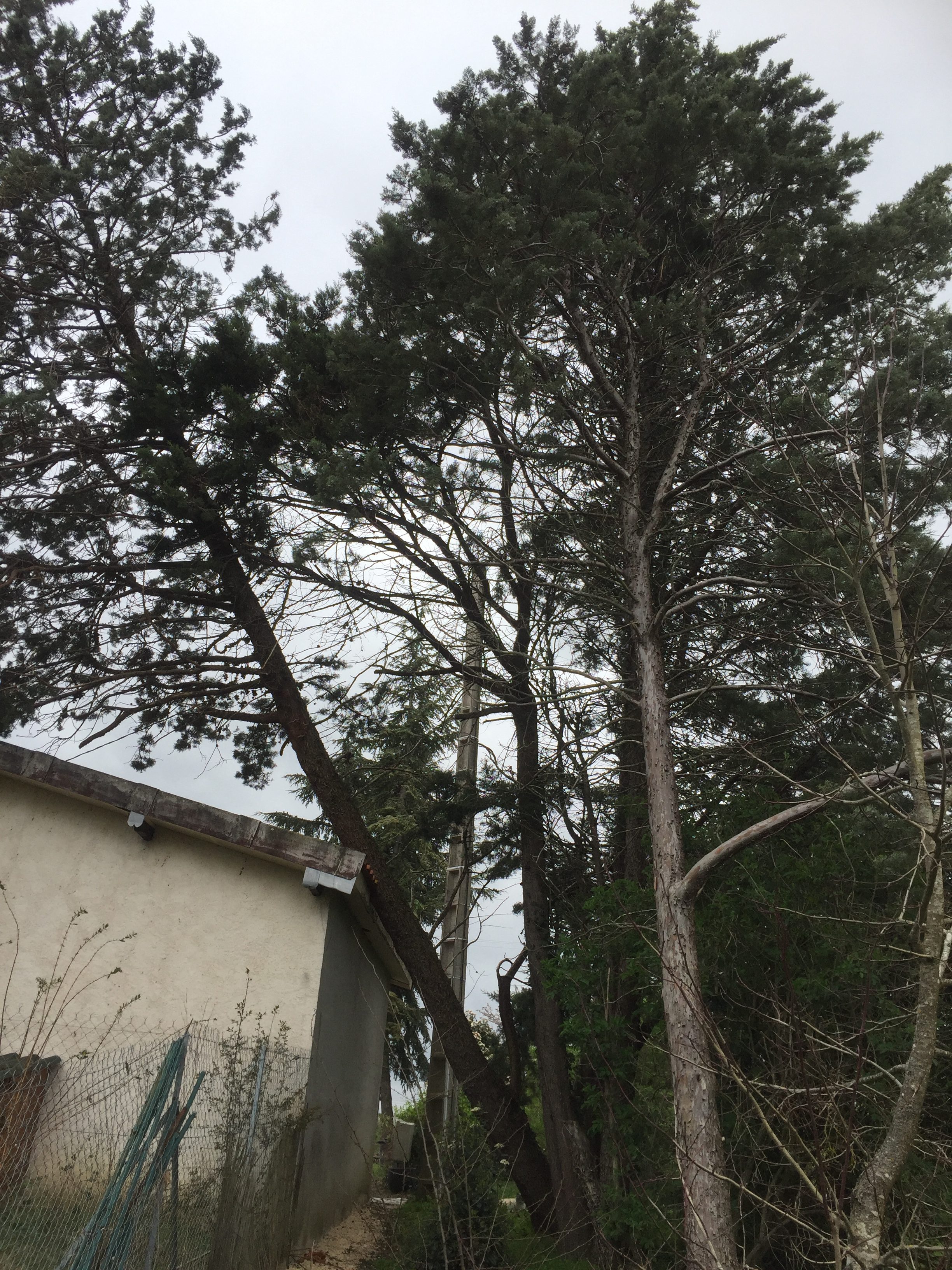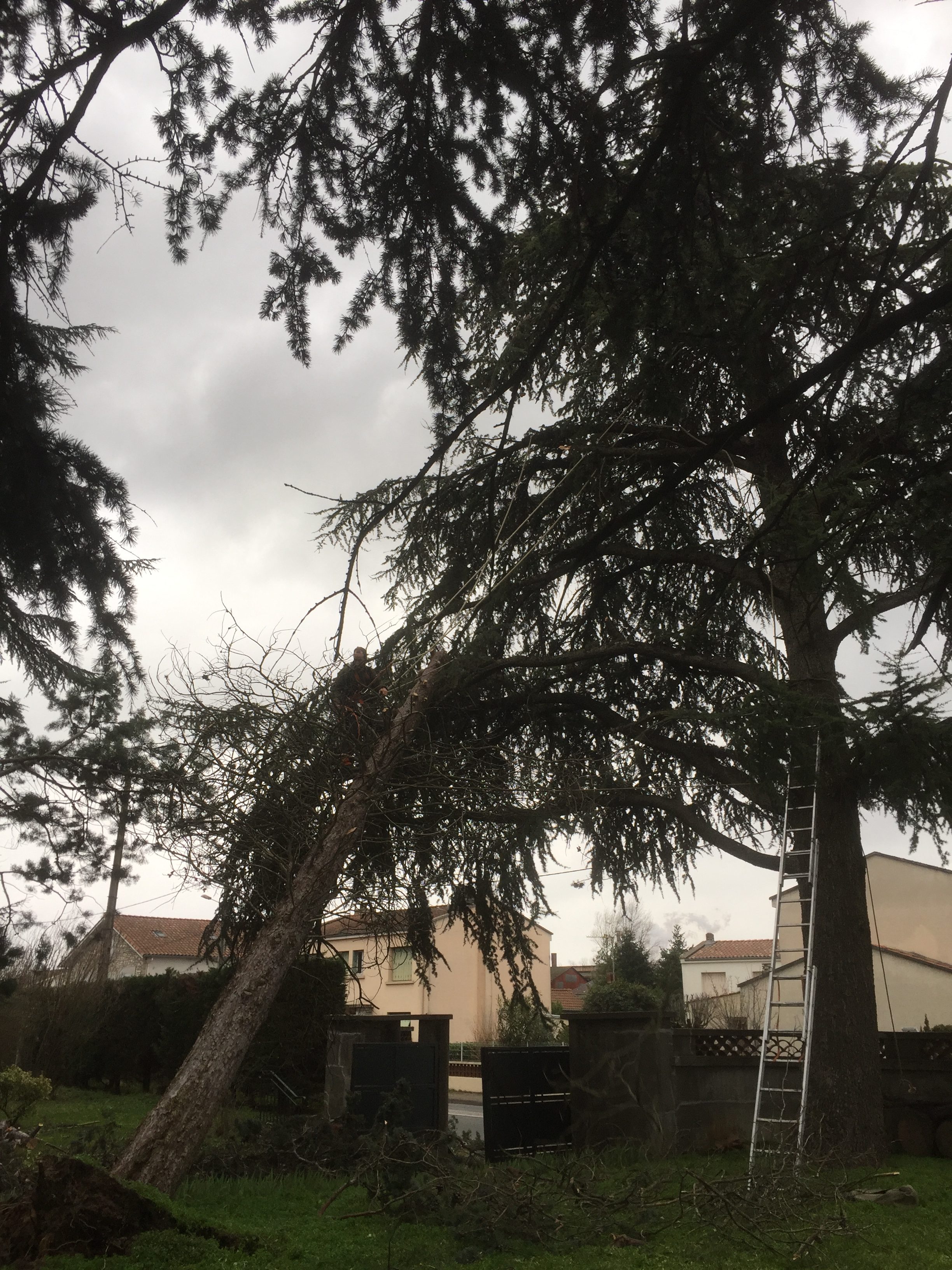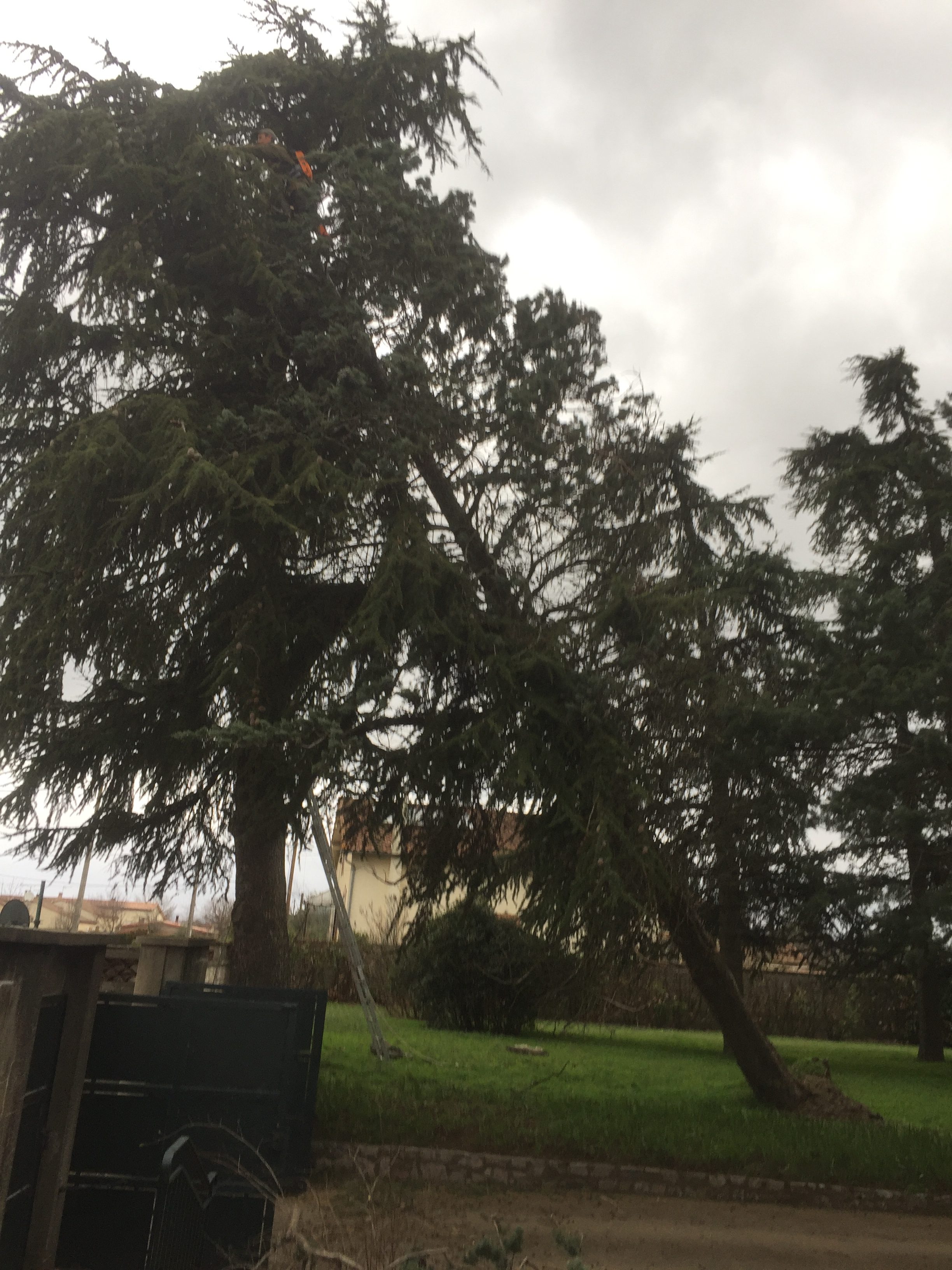 Intervention sur un cèdre menaçant de tomber sur la route suite à de grands vents