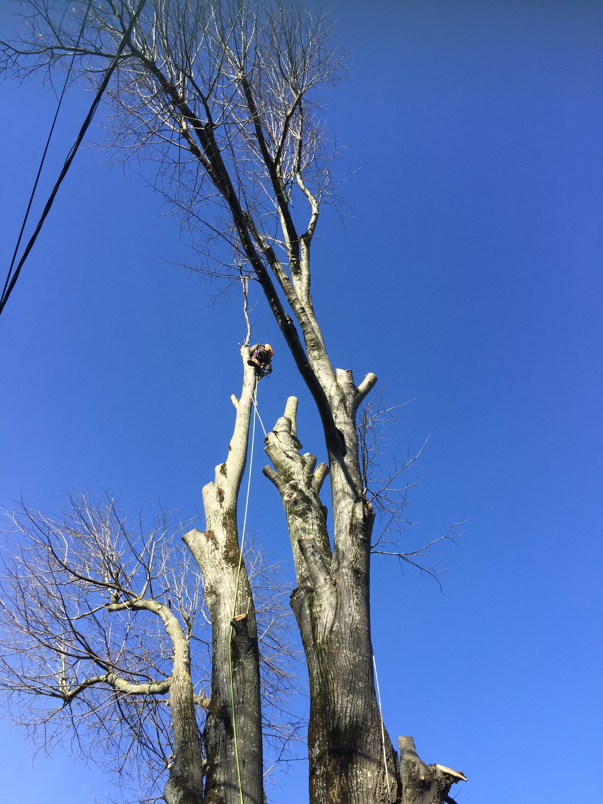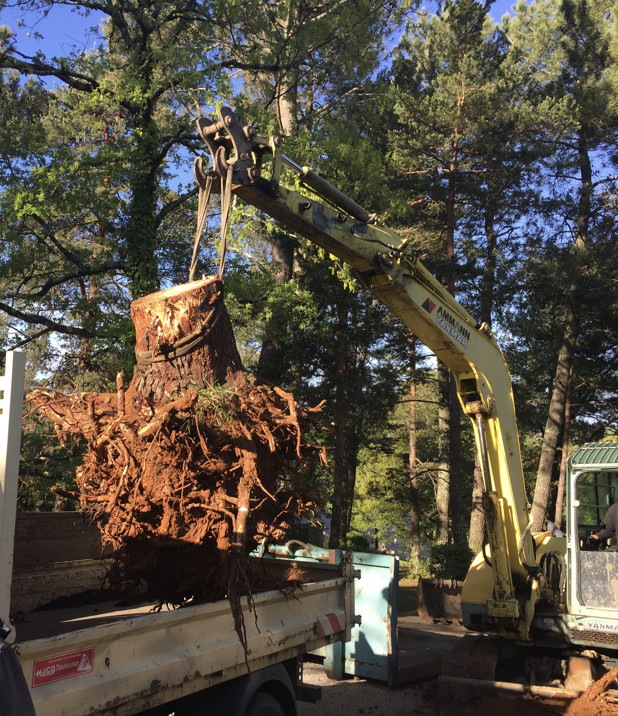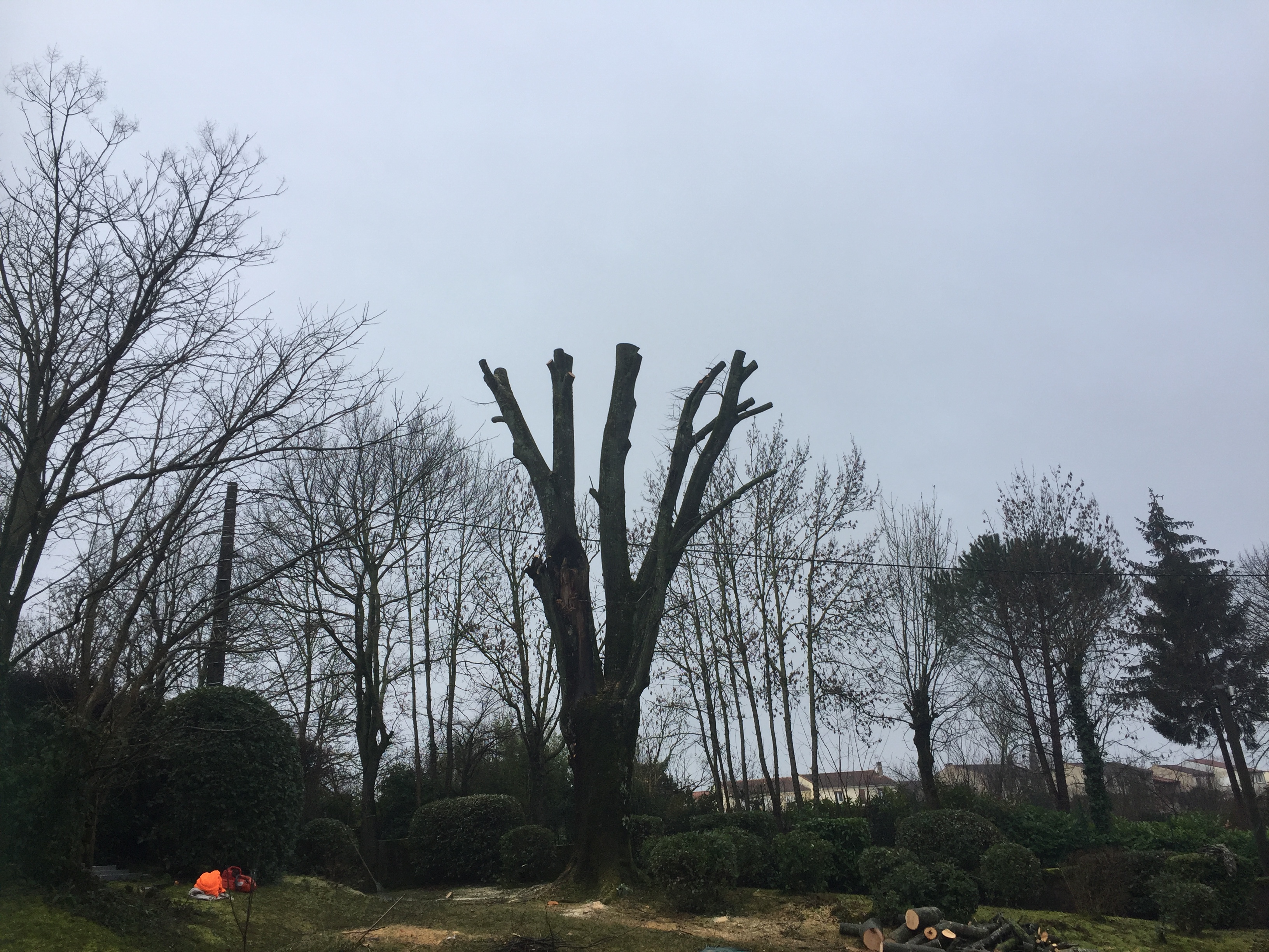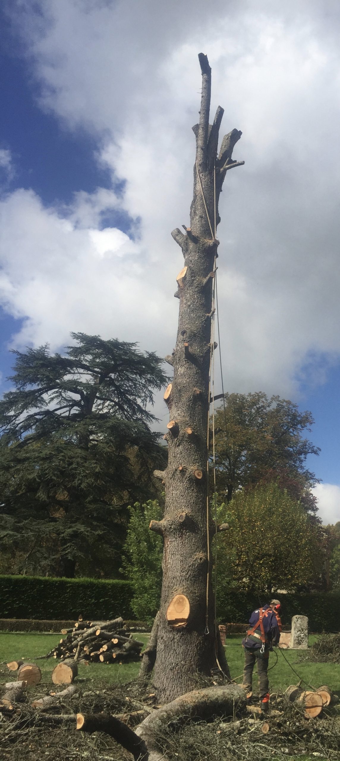 Pour l'abattage des arbres, nous procédons par démontage, en coupant des pans successifs à parti du haut. Cela permet de travailler de manière efficace et en toute sécurité, et il n'y a pas d'aléas liés à la chute du tronc.